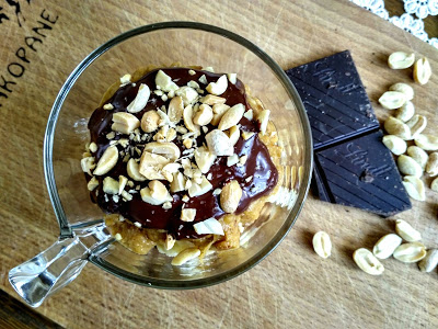 – 4 kostki gorzkiej czekolady (ok. 20 g),- łyżka orzechów arachidowych (ok. 10 g).