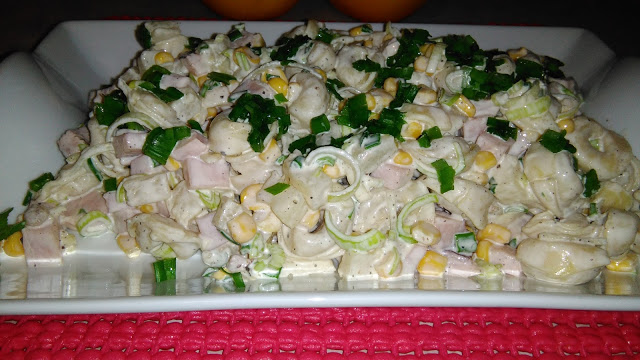 Robiąc przegląd moich szafek trafiłam na makaron tortellini – niestety moja ulubiona sałatka zawiera pomidory,które o tej porze roku nie są zbyt smaczne i wartościowe…..wiec postawiłam na ananasa,pora i kukurydzę…..przyznam,że wyszło smacznie.Przekonajcie się sami.