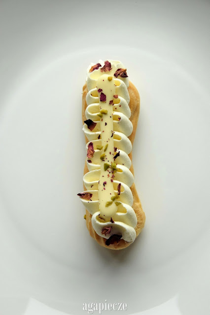 Elegancki, walentynkowy (lub nie ;)) deser z eklerem w roli głównej z delikatnym kremem różanym, udekorowany kremem mascarpone, białą czekoladą z pistacjami i płatkami róży.
