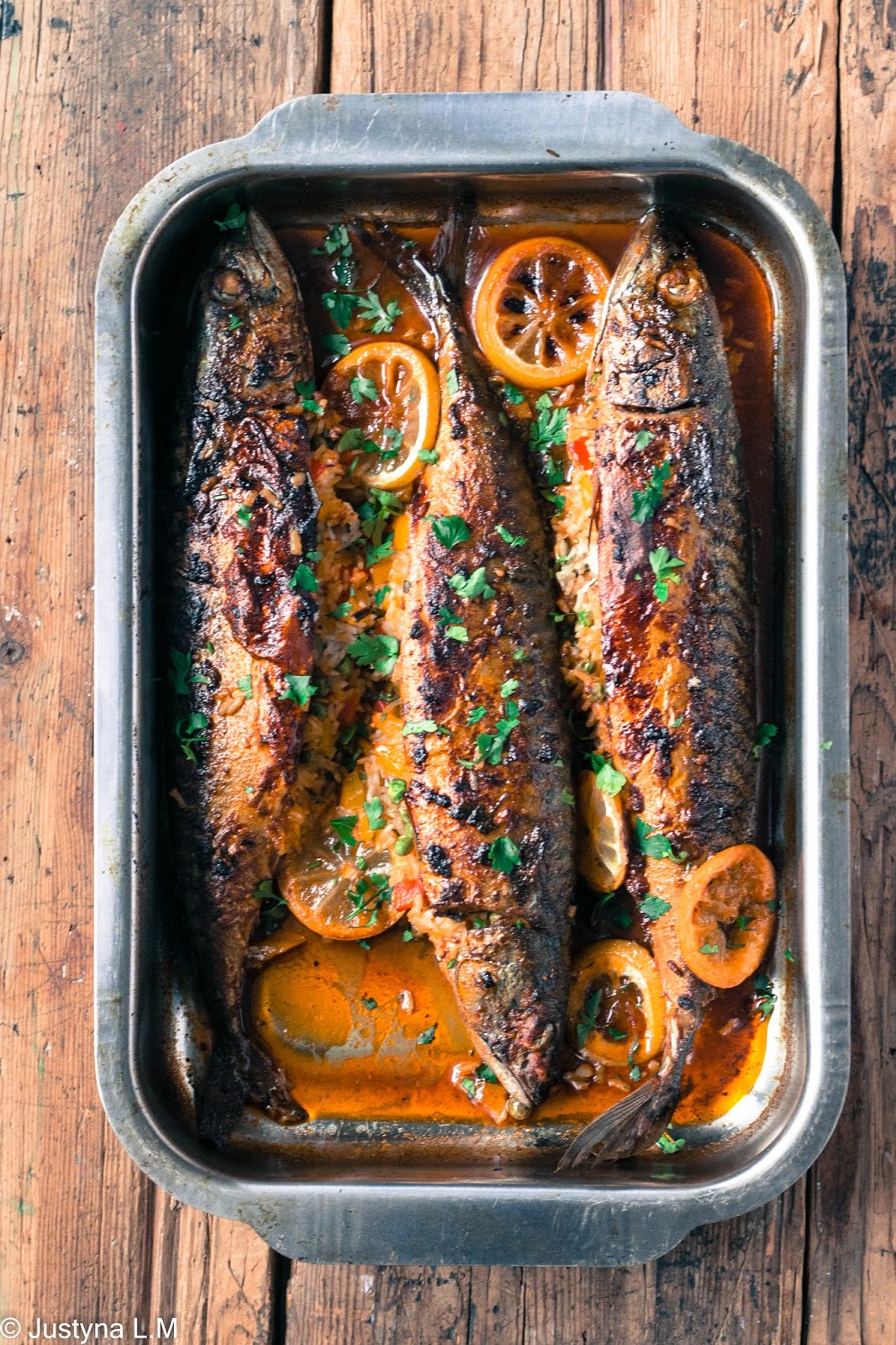 Pyszny pomysł na bardzo smaczny obiad, pieczona makrela z farszem ryżowym. Wyszło pysznie i syto. Rybę należy zamarynować min. 30 minut przed włożeniem do piekarnika.