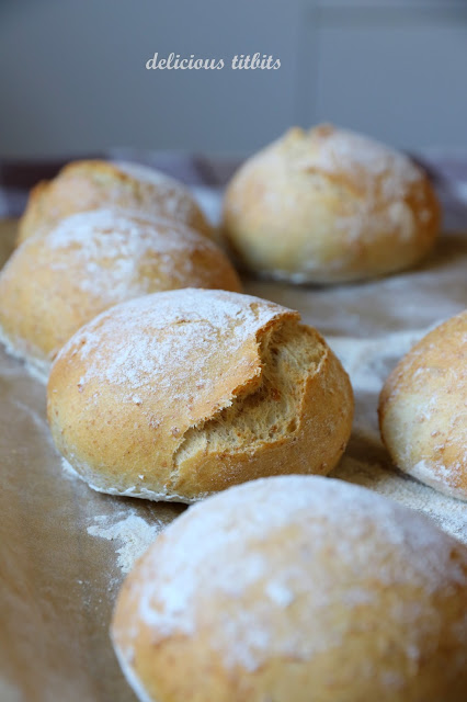 Nikt nie lubi gdy bułka następnego dnia jest gumowata.Te są dodatkiem mąki pełnoziarnistej … można by rzec, że grahamki. Syte i chrupiące, idealne na śniadanie.