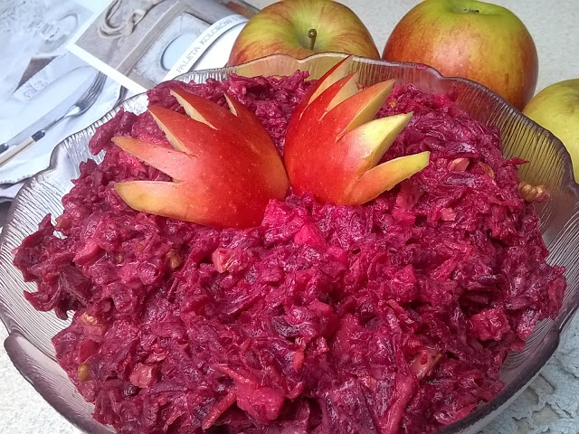 6-8 buraczków średniej wielkości1 marchewka1 jabłkogarść orzechów włoskich2 ząbki czosnku1 łyżka cukru brązowegosólpieprz2 łyżki majonezu 2 łyżki śmietany kwaśnejBuraczki ugotować,obrać