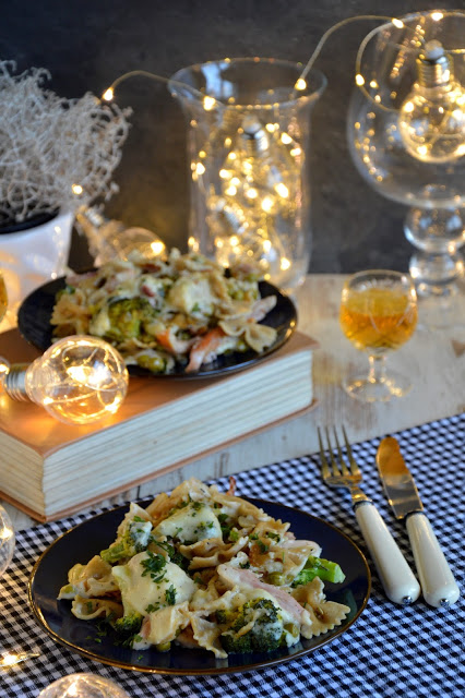 Zapiekanka makaronowa z wędzonym kurczakiem, brokułem i groszkiem