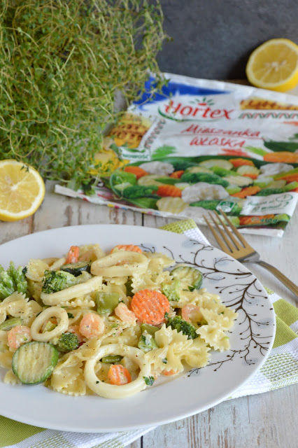Przepyszne danie, które zagościło u mnie w niedzielę. Zasmakuje niewątpliwie każdemu. Ba! Uważam nawet, że zjedzą je ze smakiem osoby nie lubiące owoców morza 😉 Przygotowanie dania nie wymaga za to od nas spędzenia całego dnia w kuchni. To zasługa głównie gotowej mieszanki warzywnej firmy Hortex.