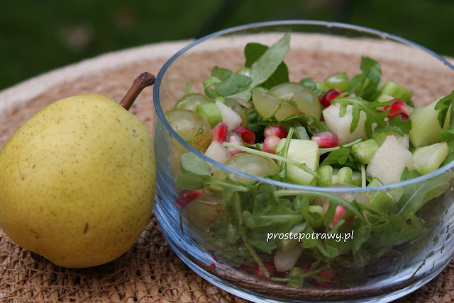 Składniki : opakowanie rukoli2 gruszkigranatduża kiść białego winogrona2 zielone ogórki4 łodygi selera…