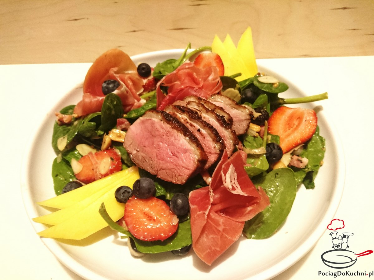 Sałata ze szpinaku z bekonem i kaczką – na ciepło – duża porcja sałaty idealna na lunch lub lekki obiad. Szczerze mówiąc na początku miała to być sałata ze szpinaku z bekonem i szynką parmeńską, ale ponieważ akurat mieliśmy w lodówce piersi z kaczki, to rzutem na taśmę wzbogaciliśmy przepis.