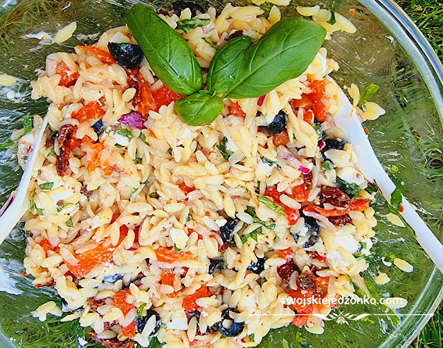 Pyszna i aromatyczna sałatka z makaronem w kształcie ryżu i pieczoną papryką,…