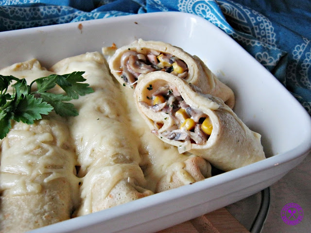 Pyszne naleśniki z wytrawnym nadzieniem oraz kremowym sosem. Zapieczone z serem smakują wyśmienicie!