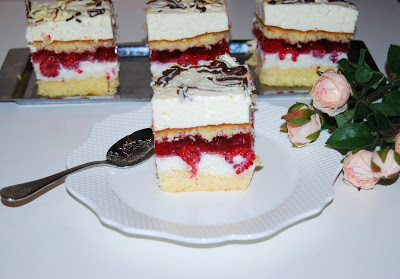 Wspaniałe ciasto z malinami. Biszkopt przełożony masą jogurtową, masą śmietanową i galaretką.…