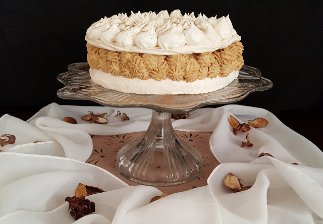 Dwa blaty pysznej bezy przełożone bitą śmietaną o smaku kawowym, a całość oprószona delikatnie kawą rozpuszczalną.Krem kawowy ma bardzo wyraźny/mocny smak, nie jest zbyt słodki, więc wyłożony