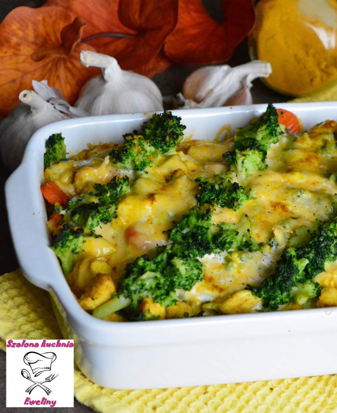 Bardzo pożywna zapiekanka na bazie ryżu, kurczaka mocno przyprawionego curry, zielonego brokułu,…