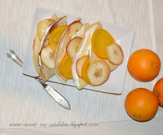 Naszło mnie by zrobić naleśniki, ale nie znowu takie zwyczajne. Wpadłam na pomysł aby poddusić owoce w syropie cukrowym, a same naleśniki poprzekładać słodkim serem. Całość wyszła słodka, a zarazem lekko kwaśna, dzięki pomarańczy.