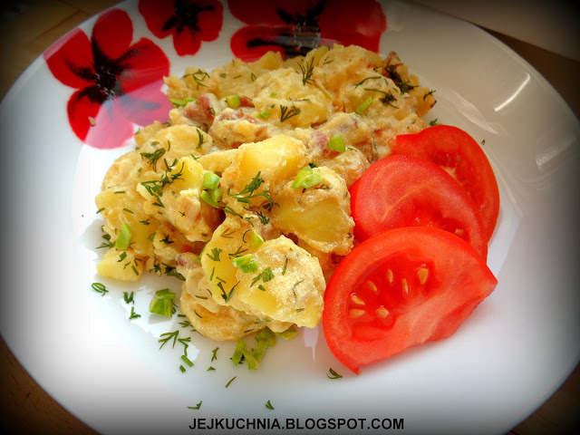 Składniki:8 mniejszych ziemniaków (ugotowanych),100 g boczku wędzonego,1/2 małej cebuli,1/2 łyżki posiekanego