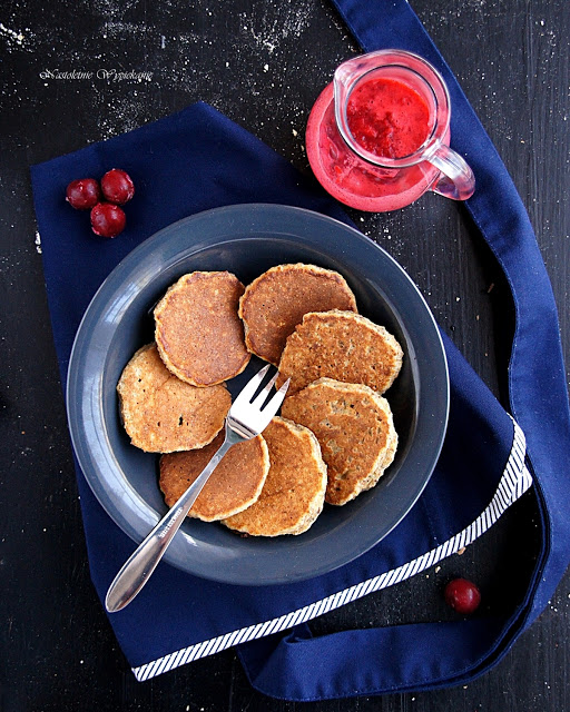 Patelnię rozgrzać z łyżeczką oleju. Przetrzeć powierzchnię ręcznikiem papierowym, by rozprowadzić tłuszcz na patelni. Łyżką nakładać porcje masy jaglanej (1 łyżka= 1 placuszek). Placuszki smażyć z obu stron po kilka minutek pod przykryciem do zarumienienia. Podawać na ciepło ze zmiksowanymi na puree wiśniami (wcześniej wiśnie odpestkować i według upodobań