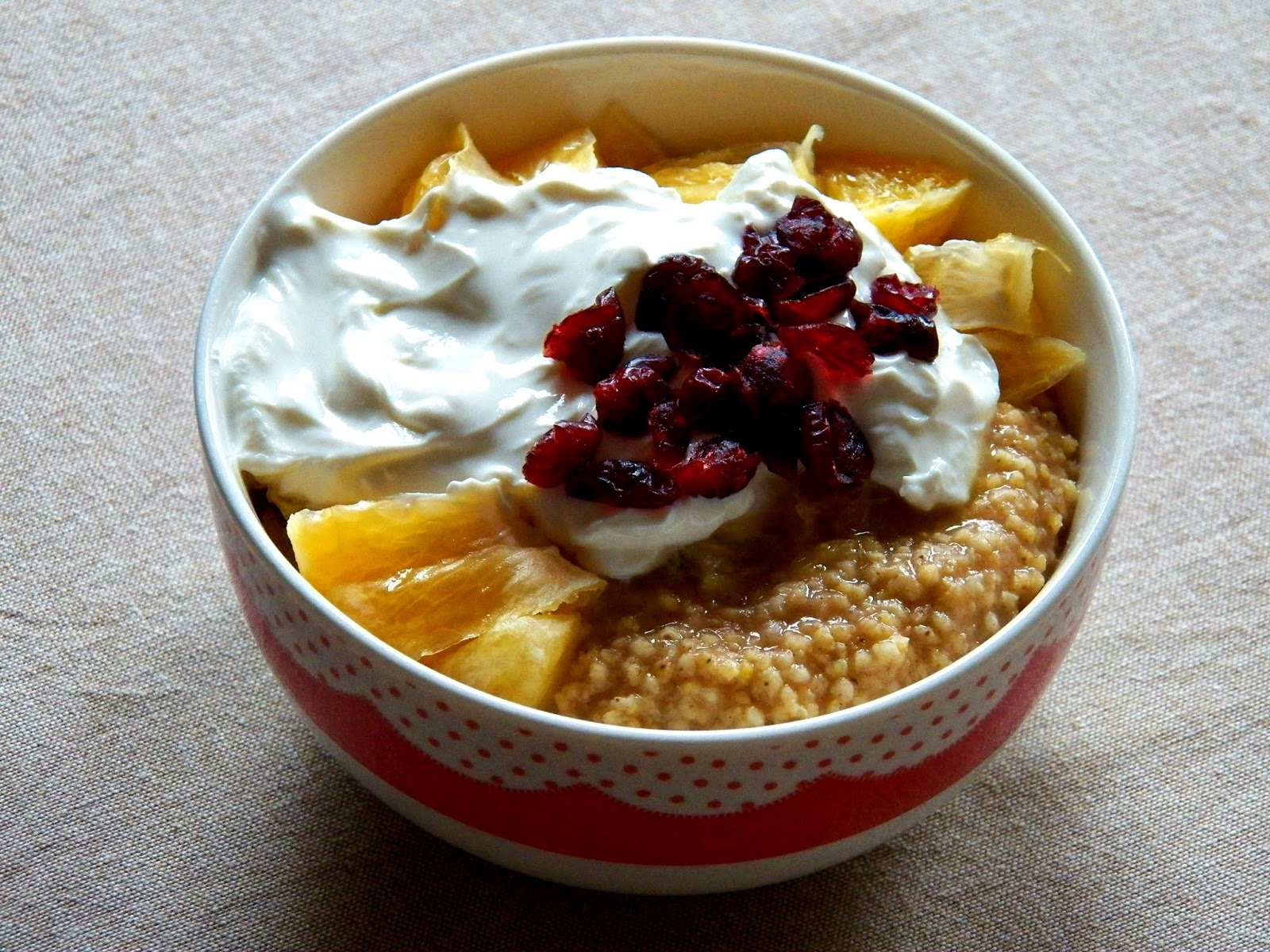kasza jaglana z pomarańczą, twarożkiem, suszoną żurawiną, miodem i cynamonemmillet with orange,…