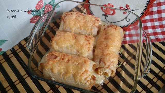 Zrolowane naleśniki wypełnione szynką i stopionym serem pleśniowym, zapieczone z serową skorupką.…