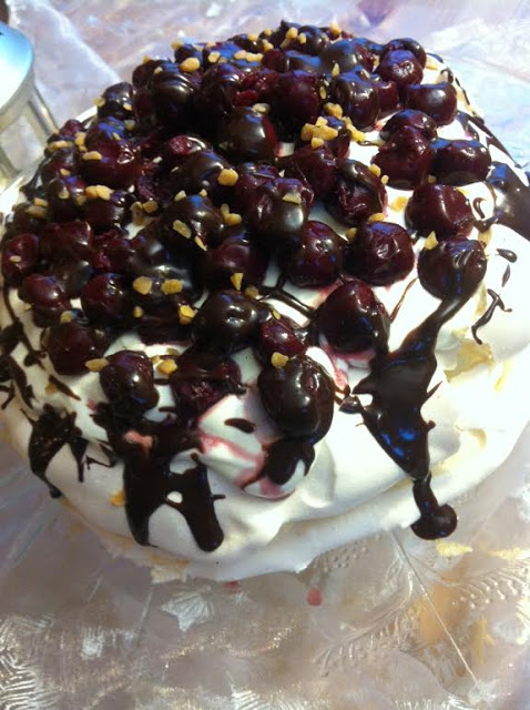 Tort bezowy z bitą śmietaną i mascarpone, wiśniami i polewą czekoladową (Tort Pavlova)