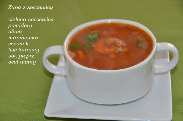 250 g zielonej soczewicy2 marchewki4 pomidory1/4 szklanki oliwyczosnekliść laurowysól, pieprz1 łyżka octu winnegoMarchewkę pokroić w cienkie plastry, dodać czosnek, poddusić razem na rozgrzanej oliwie, dodać przepłukaną soczewicę, pomidory, zalać wodą dodając liść laurowy i gotować do miękkości ok 30 minut.