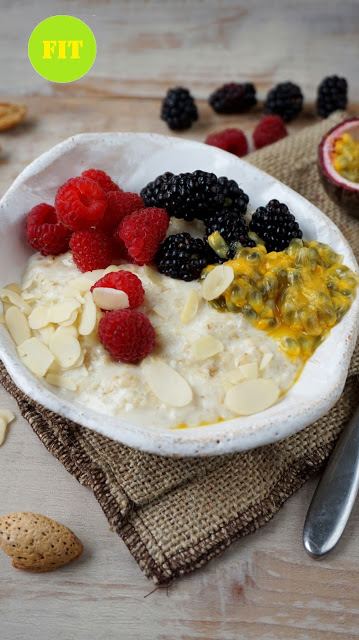 Owsianka podwójnie migdałowa z dodatkiem świeżych sezonowych owoców. Przepyszny i zdrowy początek…