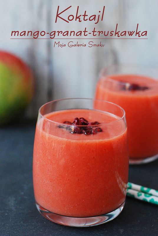 Truskawki odszypułkować, mango obrać ze skórki, pokroić na mniejsze kawałki. Z owocu granata wydobyć ziarenka. Do blendera wlać wodę, dodać wszystkie owoce i zmiksować.