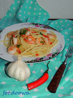 Spaghetti z czosnkiem i krewetkami.