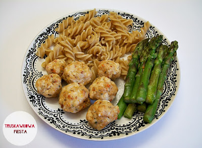 100g mięsa mielonego drobiowego1/2 pęczka zielonych szparagów40g suchego makaronu pełnoziarnistegoprzyprawy: pieprz cytrynowy, suszony koperek, czosnek granulowany,