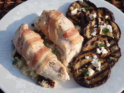 Dzisiaj polecam soczyste mięsko zamarynowane wcześniej w jogurcie i pieczone w piekarniku. Do tego kuskus z dodatkiem moich ulubionych suszonych pomidorów oraz grillowany bakłażan z fetą.