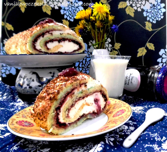 Do tej pory, tylko raz na blogu pojawił się przepis na roladę biszkoptową. Wówczas krem był malinowo-bananowy. Dzisiaj chcę wam zaproponować nieco inną wersję, choć niemniej smaczną. Przepis powstał trochę na kształt popularnego tortu szwarcwaldzkiego z uwagi na podobne składniki. A więc w rzeczy samej będzie : ciemna gorzka czekolada,