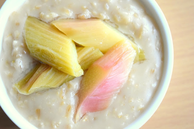 Od jakiegoś czasu w lodówce zalegała mi puszka mleczka kokosowego, więc wykorzystałam ją do przygotowania pysznej i kremowej owsianki. W koszyku z warzywami i owocami zauważyłam kilka łodyg świeżutkiego rabarbaru, a więc i one znalazły się w tej śniadaniowej miseczce. Owsianka jest przepyszna! A rabarbar mięciutki, słodko-kwaśny. Te dwa składniki