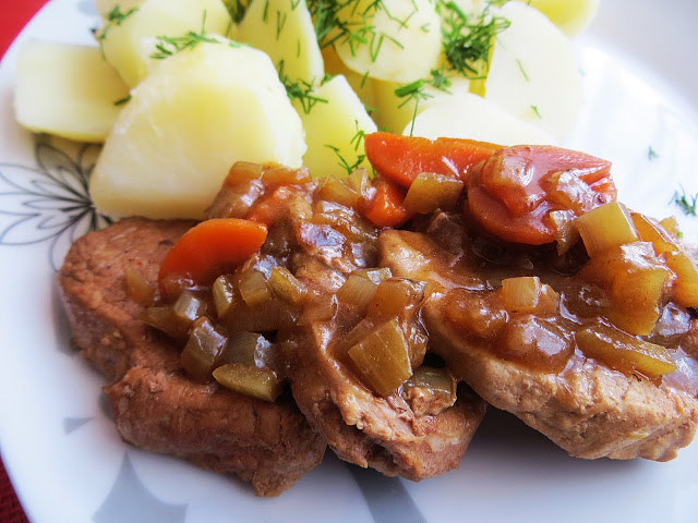 Składniki (2 os.):300 g polędwiczki wieprzowej1 cebula1 średnia marchewka250 ml piwa ciemnego5 ziarenek ziela angielskiego6 goździkówsól, papryka ostra mielona