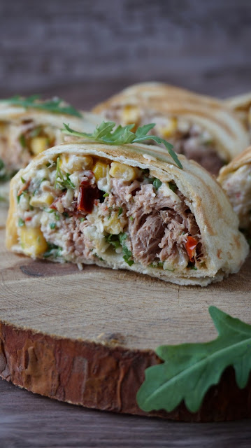 Wrapy z tortilli z wyrazistym tuńczykiem, lekko pikantna rukolą i słodkawa kukurydza to świetna propozycja na przekąski na przyjęcia. Równie dobrze sprawdzi się jako pożywne i pełnowartościowe śniadanie. Gorąco polecam!