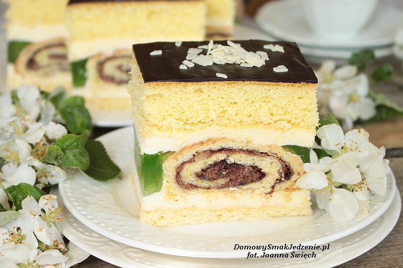 Białka ubijamy na sztywno. Stopniowo dodajemy cukier cały czas ubijając. Następnie dodajemy stopniowo żółtka, miksujemy. Na koniec dodajemy przesiane mąki i delikatnie mieszamy przy pomocy szpatułki. Przekładamy ciasto do blaszki (ok. 35×20