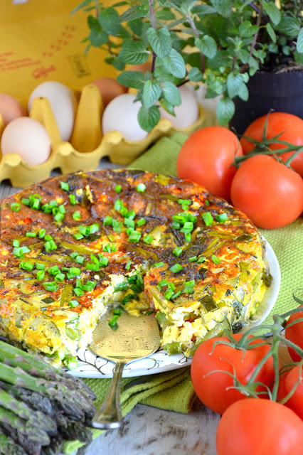 Frittatę ze szparagami, cukinią i pomidorkami zrobiłam dla urozmaicenia na obiad. Jest to pyszne danie, ale frittatę najlepiej robić na bardzo dużej patelni. Moja z pokrywką była zbyt małą i frittata wyszła dosyć wysoka, długo się ścinał wierzch i miałam problem z przełożeniem jej na talerz, bo frittatę obraca