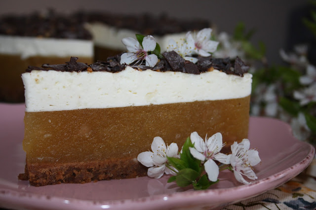 spód:250 g kakaowych herbatników petit beuerre CUKRY NYSKIE150 g masłamasa jabłkowa:3 szklanki musu z jabłek3 galaretki cytrynowemasa serowa:3/4 szklanki śmietany kremówkiszklanka sera trzykrotnie mielonego250 g sera