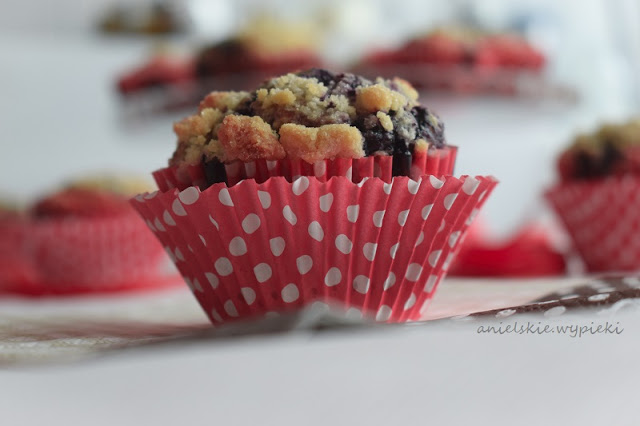 Mufinkowy szał ciąg dalszy.Tym razem z pysznymi leśnymi jagodami i chrupiącą kruszonką.Mniejsłodkie niż mufinki z krówką.Mniej ulubione przez moje dzieci,ale i tak zjedzone w całości.Ja uwielbiam je pod każdą postacią.