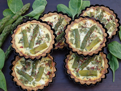 Małe pożywne tarty z zielonymi wiosennymi dodatkami w postaci szpinaku i szparagów. Doskonała przekąska, małe tarty można też zabrać na piknik.