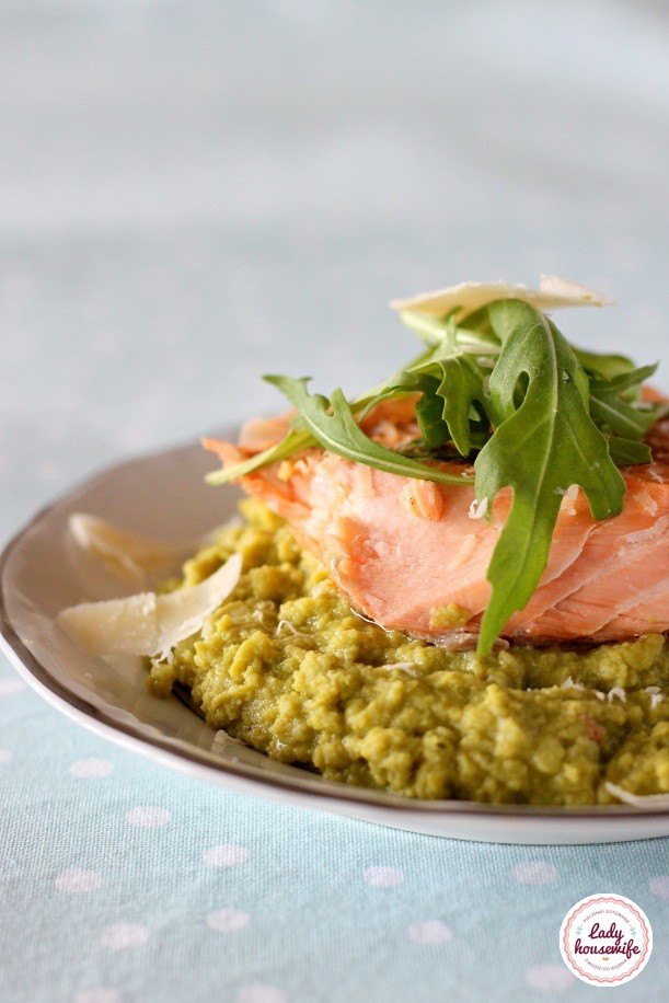 Pieczony łosoś na puree z groszku z sosem chrzanowym
