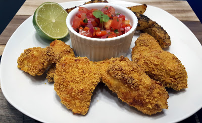 Pieczone kąski z kurczaka w chrupiącej panierce z ostrych chipsów nachos, a do tego orzeźwiająca salsa paprykowo-pomidorowa. Na ten przepis natknęłam się przeglądając stare magazyny kulinarne i od razu wpadł mi w oko (lekko go skorygowałam pod siebie 😉). Pyszny obiad lub przekąska kolacyjna, którą na pewno nikt nie pogardzi…Ja