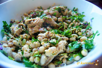 Ekspresowa sałatka z tuńczyka i białek fasoli z lekkim dressingiem na podstawie przepisu Nigelli Lawson z książki Nigella ekspresowo. Moje dodatki do chili i prażone ziarna. Polecam.