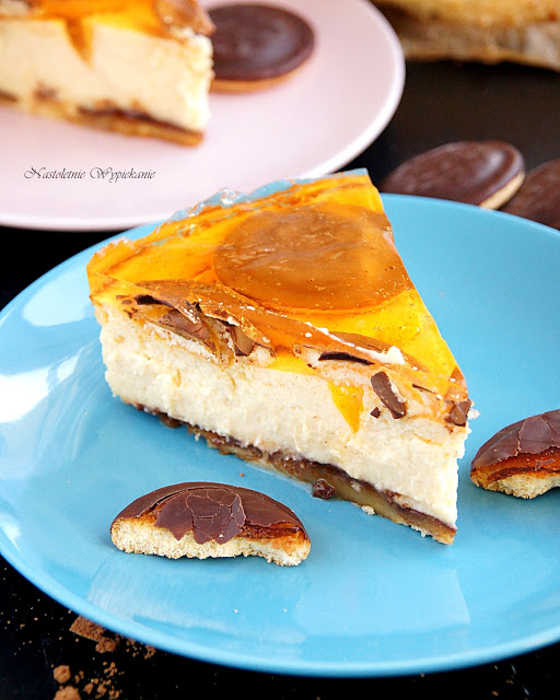 To kolejny serniczek z serii tych z popularnymi słodyczami. Był już sernik Prince Polo i z ciasteczkami Oreo. Przyszła pora wykorzystać uwielbiane przez nas Delicje- biszkopciki z galaretką oblane czekoladą. Sernik pieczony właśnie na Delicjach z pomarańczową galaretką u góry. Ciekawym składnikiem jest sok dodany do masy