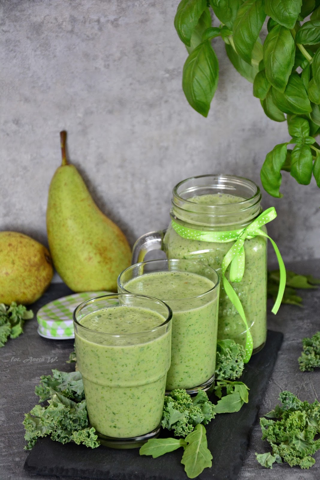 Koktajl witaminowy z jarmużem, którego smak mnie zachwycił! Same zdrowe składniki, zielony, apetyczny kolor – czego więcej potrzeba? 🙂 Składniki dobierałam w taki sposób, by było po prostu smacznie. Jarmuż, który wg mnie nie ma specjalnego, wyrazistego smaku (Zuzia go nazywa zieloną kapustką i coś w tym jest, bo