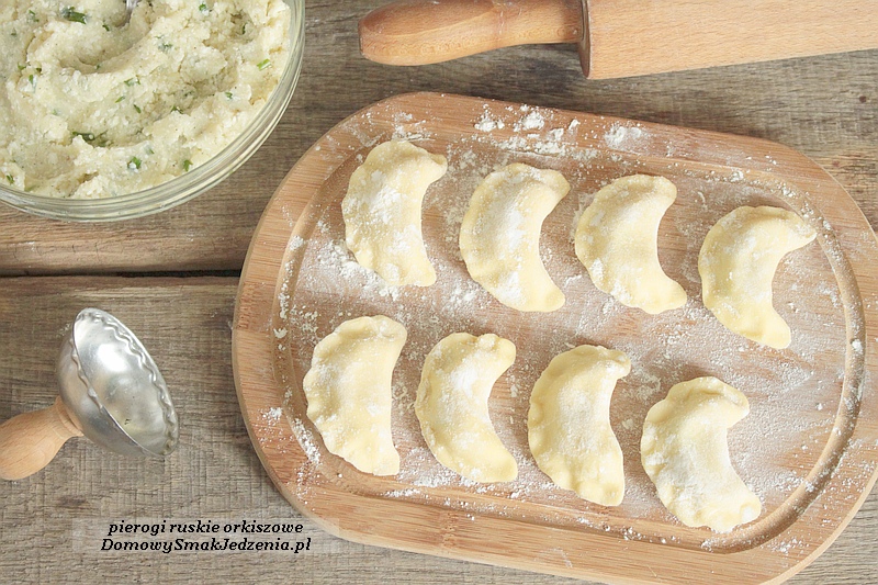 Ziemniaki obieramy, gotujemy w lekko osolonej wodzie. Odcedzamy, ugniatamy. Wystudzone ziemniaki ugniatamy z serem, doprawiamy solą oraz pieprzem. Cebule kroimy w kosteczkę, podsmażamy na maśle i dodajemy razem z posiekanym szczypiorkiem