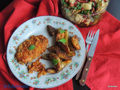 Pieczone ziemniaki z chrupiącym filetem z kurczaka.