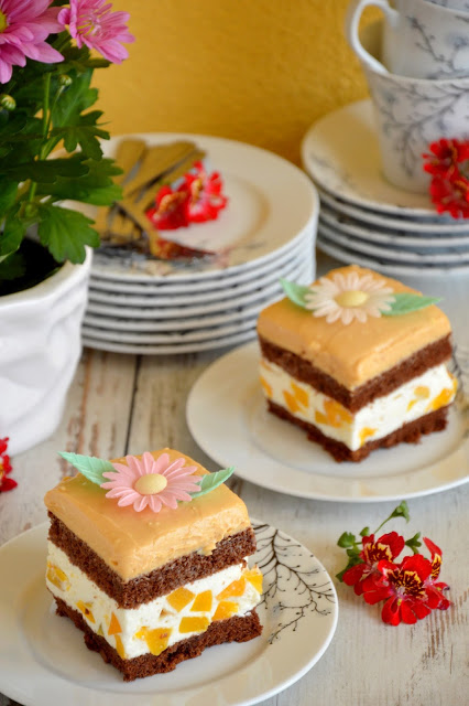 Jak tam Wasze wypieki na Dzień Matki? Ja upiekłam ciasto z kakaowym biszkoptem, przekładane śmietaną z brzoskwiniami, a na wierzchu z pysznym, słodkim toffi. Lubię eksperymentować i łączyć ze sobą różne smaki. To zestawienie uważam za strzał w dziesiątkę. Ciasto jest bardzo pyszne.