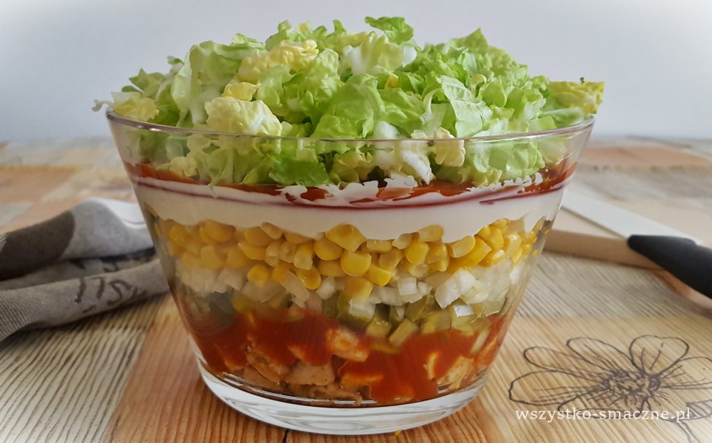 Moja wersja jest klasyczna, warstwowa z pikantnym ketchupem, ogórkami konserwowymi, cebulką i kukurydzą, no i oczywiście mięso na