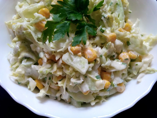 Składniki:1 mała główka młodej kapusty1/2 puszki kukurydzy1 zielony ogórek1/2