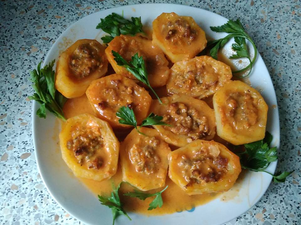Zapiekane kartofle z dziurami faszerowane mięsem mielonym z sosem pomidorowym. Składniki kartoflemielone…