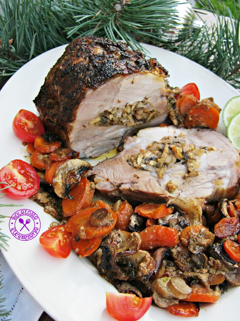 Rewelacyjna i krucha karkówka z dodatkiem miodu spadziowego. Wnętrze karkówki wypełnione pieczarkami…