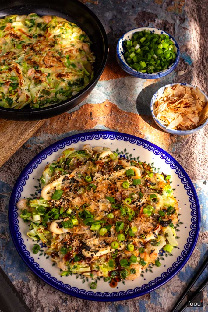 Okonomiyaki — japoński placek z kapusty z krewetkami