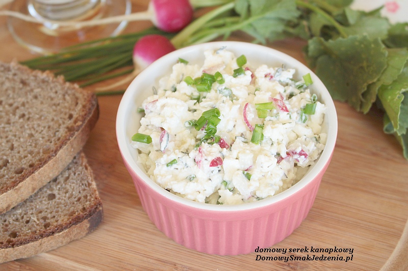 Serek dokładnie mieszamy ze śmietaną lub jogurtem. Rzodkiewkę kroimy np. w kosteczkę i dodajemy ją wraz ze szczypiorkiem do serka. Doprawiamy solą oraz ulubionym ziołem. Wszystko mieszamy i podajemy.